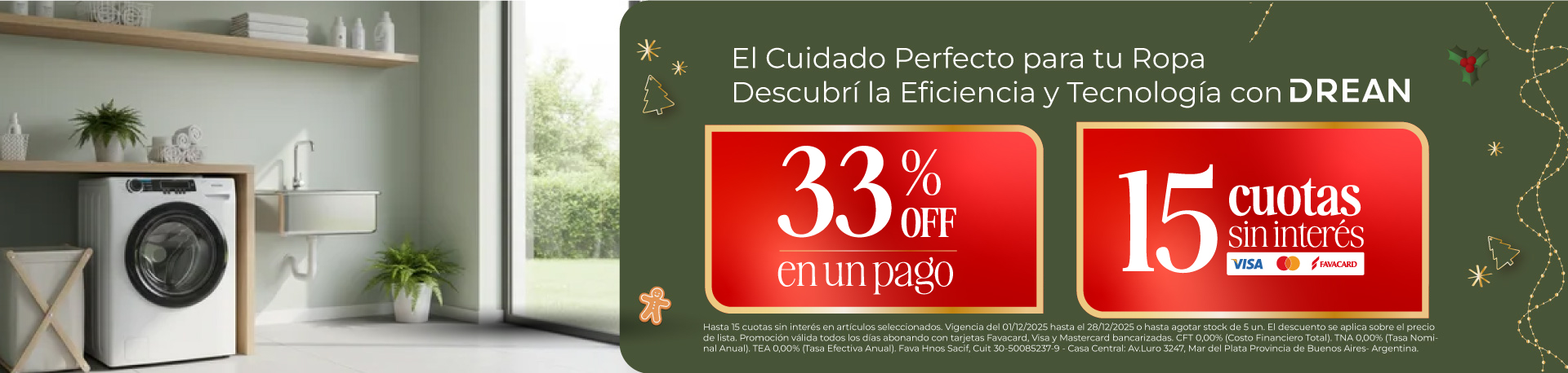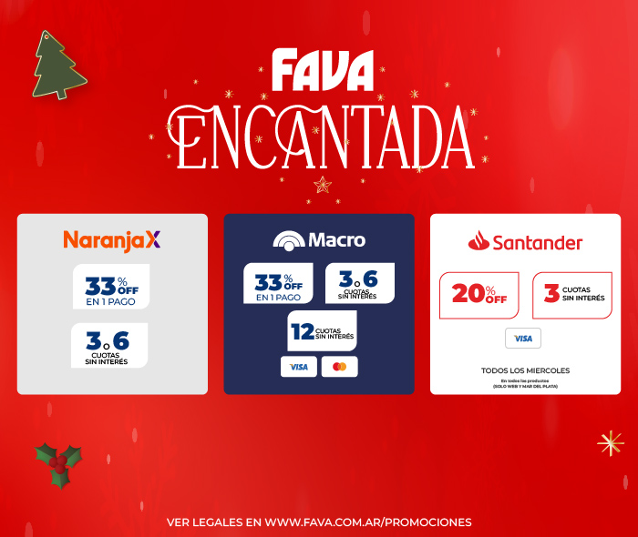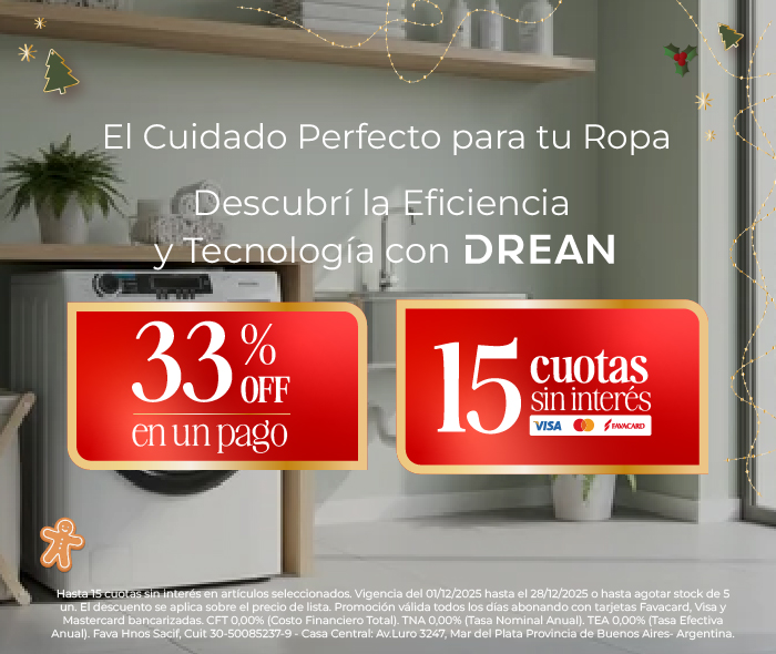 Legal: Promoción hasta 12 cuotas sin interés abonando con Tarjetas de Banco Nación Visa y Mastercard + 15% de descuento pagando a través de MODO, sin tope de reintegro en productos seleccionados. Exclusivo VENTA PRESENCIAL.Vigente desde el 01/09/2025 al 30/09/2025. El descuento se aplica sobre el precio de lista. Valida en las sucursales arriba mencionadas. No aplica para venta web, venta telefonica u otras sucursales que las antes mencionadas.Fava Hnos Sacif, Cuit 30-50085237-9 - Casa Central: Av.Luro 3247, Mar del Plata Provincia de Buenos Aires- Argentina.